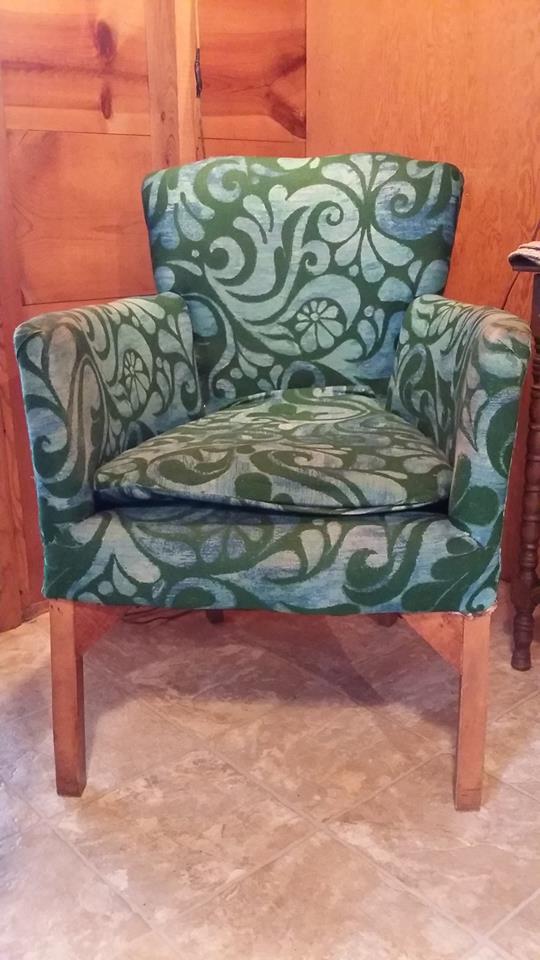 Before turning out the lights, I glance at a small, funny, poorly cushioned green parlor chair in the cabin’s boxy main room. The chair, parked in a corner under the Old Style Place.