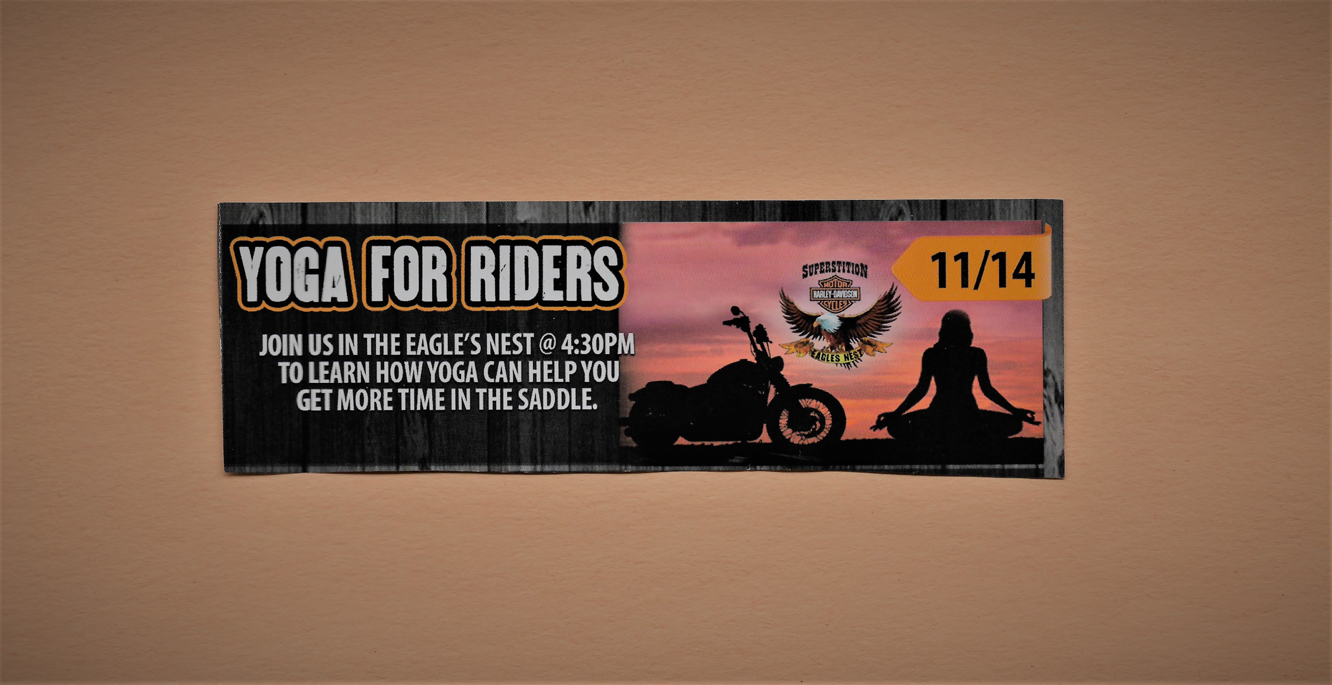 Yoga for Bikers is restarting Nov. 14, at 4:30 in the Eagles’ Nest at Superstition Harley Davidson. One Wednesday a month, riders and anyone interested will gather for simple movement and breath work. This beginner level class is open to anyone. This is offered to riders because when sitting a long time on the bike, it helps to move and open up the areas where we feel tightness: hips, shoulders, and neck. The purpose is to keep riders in the saddle by working gently toward flexibility and balance.