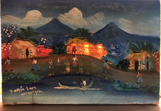 My daughter returned from a study trip to Nicaragua several years ago and gave me this small painting from a local artist. Today, sunlight fell on it from behind so it appeared as if lights were on inside.