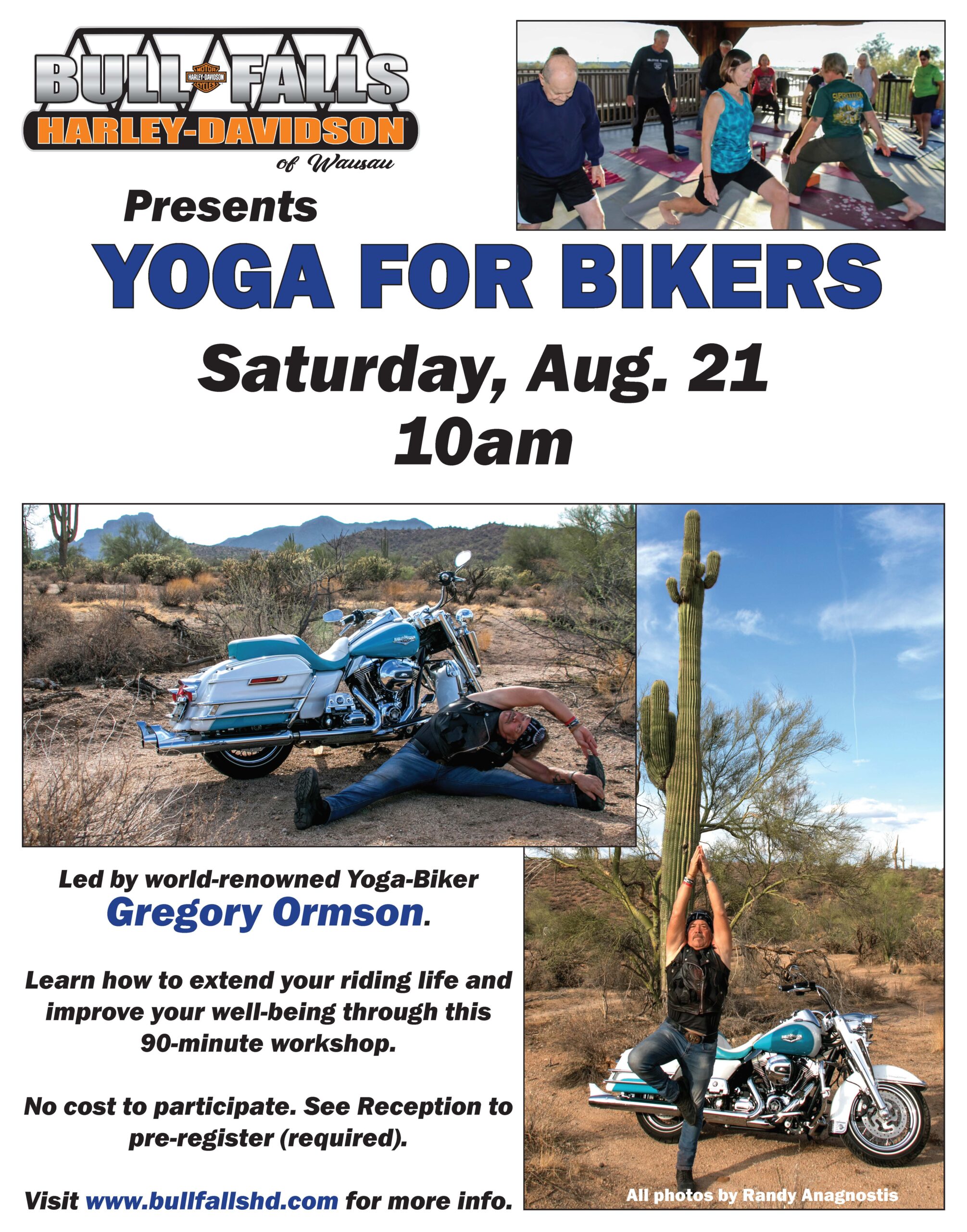 Learn how to extend your riding life and improve overall well-being through a FREE 90-minute yoga workshop at on Saturday, Aug. 21, where Gregory Ormson #motorcyclingyogig will lead “Yoga for Bikers” from 10 a.m. to 11:30 a.m. at Bull Falls Harley-Davidson, located on 1570 County Road XX in Rothschild.