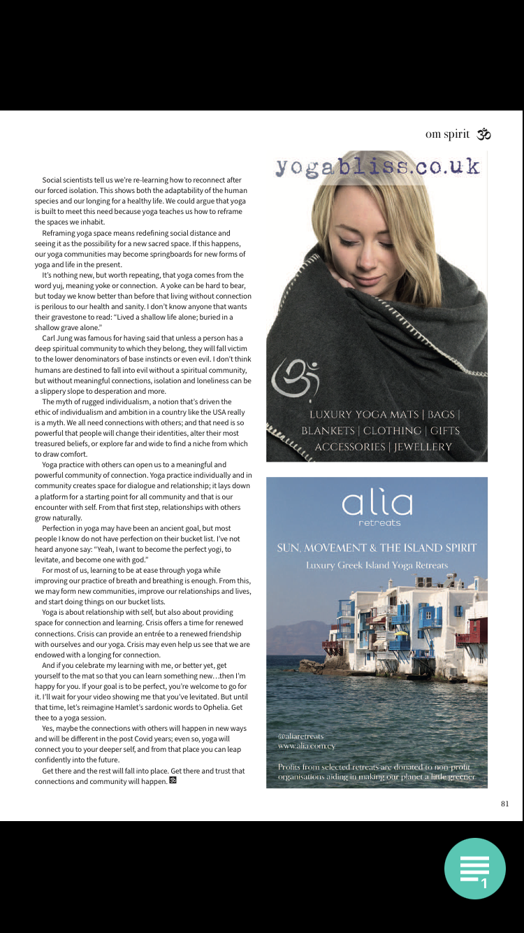 Its incumbent upon all of us to make connections with others in new ways during these COVID years. And maybe the gift of COVID is that we have time to once again let yoga lead us back to self. Finding a silver lining in COVID happens when we reconnect with self on a different level; it happens with more practice and time alone, and from that solitary space we may lean a new way to leap confidently into the future.