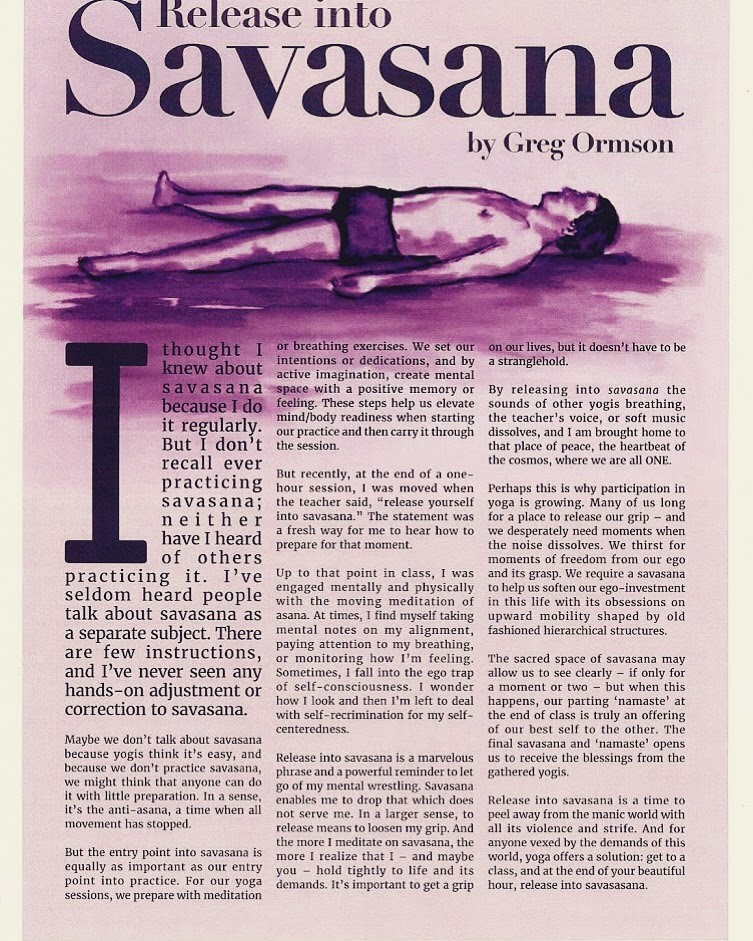 โ€œGreg, you are a remarkable writer! I found it really interesting because so often we think about what yoga gives to us or what we get but very rarely do we think about what we give to the practice. I think what you wrote was a thought-provoking and absolutely beautiful expression. Lesley Pelkey, Phoenix, Arizona