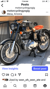 The DGR has also created incentive-based ride contests with awards to winners. In 2020, organizers held a worldwide photo contest for riders to show their bikes and riding outfits. The top 10 entrants for haute couture, matched with a classic motorcycle, were promised prizes. For the fun of it, I dressed up in my dapper ride suit next to my bike and entered the contest. I ride a Royal Enfield Classic 500 to which I’ve made a few cosmetic modifications.